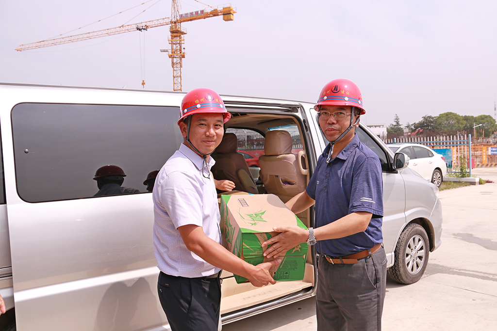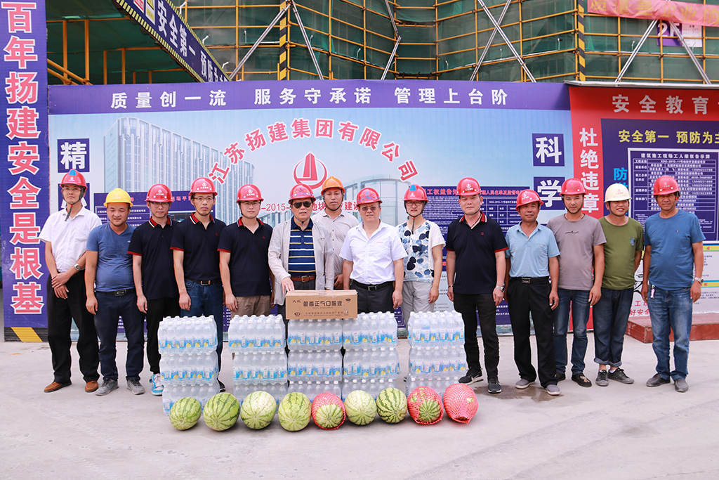 揚建網(wǎng)訊 近來,連續(xù)的高溫天氣驕陽似火地烤驗著揚州,也烤驗著我們堅守崗位的每一位員工。為切實做好項目一線防暑降溫工作,7月22日至26日,集團領(lǐng)導(dǎo)及集團工會、團委、人力資源部、安全部、總師辦等相關(guān)部門負責(zé)人先后赴揚子新苑D區(qū)安置房一期北組團項目工程、警示教育基地、湯汪污水處理廠三期擴工程、現(xiàn)代農(nóng)業(yè)科技創(chuàng)新中心產(chǎn)業(yè)化基地、廣沃電氣控制成套設(shè)備項目工程、公共衛(wèi)生中心、高郵人民醫(yī)院東區(qū)醫(yī)院(二期)、儀征2017-39#地塊、化學(xué)之光、沈飛601研究所項目、揚州軟件園南區(qū)工程、華晟新型建筑科技、無錫食品城工程項目部等近20個項目部進行夏季慰問,為冒著酷暑奮戰(zhàn)在一線的項目部管理人員、施工人員送去了飲料等消暑物品。