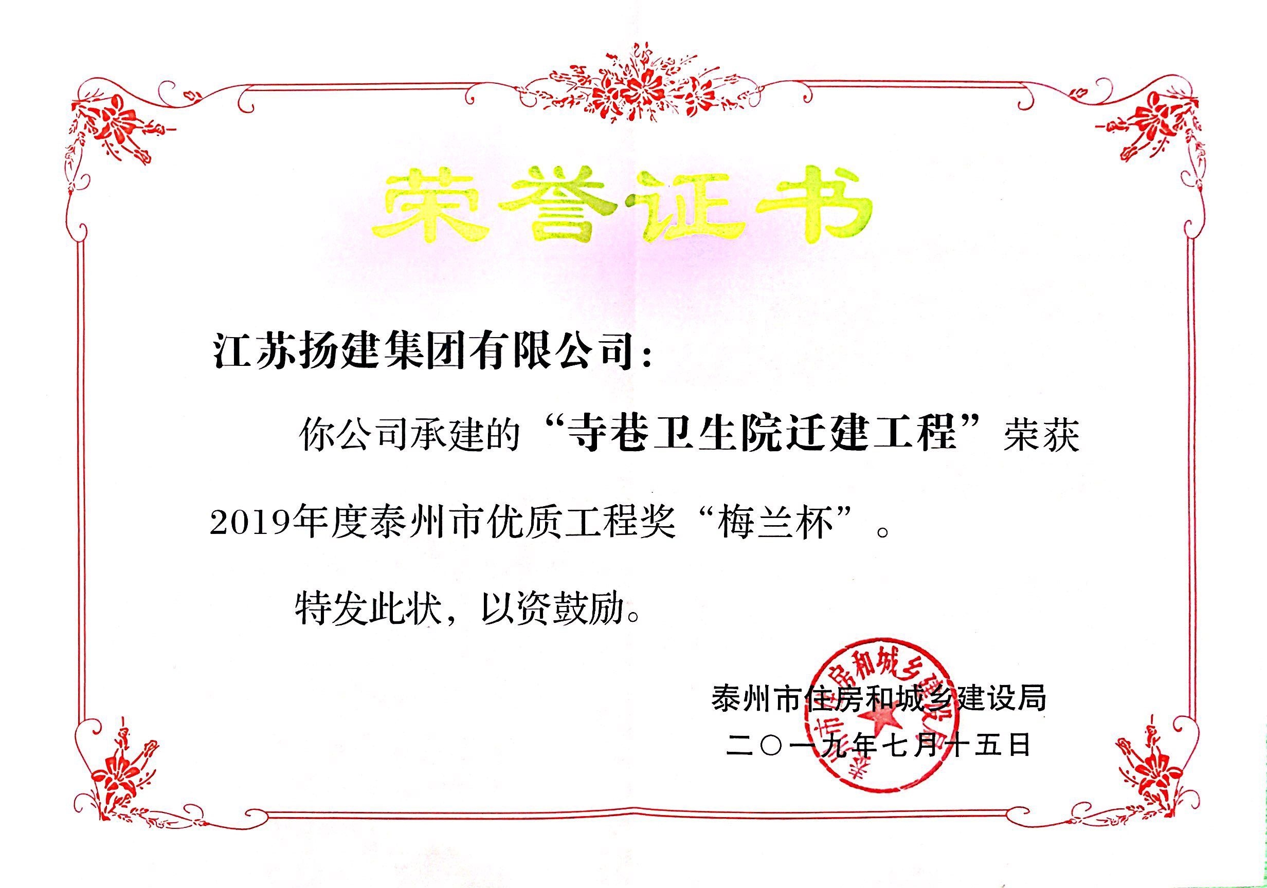 揚(yáng)建網(wǎng)訊 泰州市住房和城鄉(xiāng)建設(shè)局近日公布了2019年度泰州市優(yōu)質(zhì)工程獎(jiǎng)“梅蘭杯”獲獎(jiǎng)項(xiàng)目名單。我集團(tuán)承建、華發(fā)公司參建的寺巷衛(wèi)生院遷建工程榮獲泰州市“梅蘭杯”優(yōu)質(zhì)工程獎(jiǎng)。
