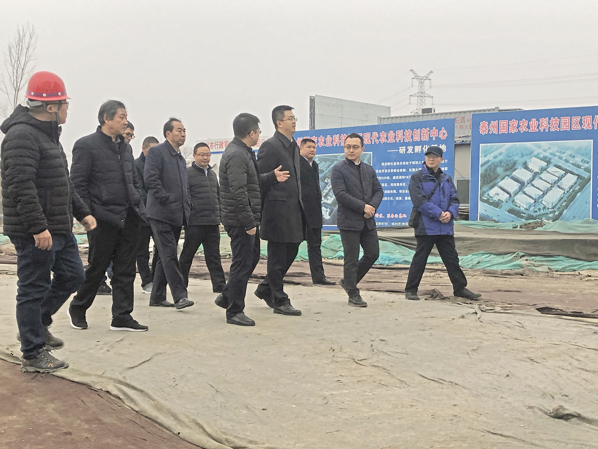 揚(yáng)建網(wǎng)訊 12月23日下午,泰州市委副書記張迅、農(nóng)業(yè)園區(qū)管委會主任張彧、副主任郁斌、泰農(nóng)集團(tuán)法人袁櫟洲一行來到泰州國家農(nóng)業(yè)開發(fā)區(qū)現(xiàn)代農(nóng)業(yè)科技創(chuàng)新中心-產(chǎn)業(yè)化基地進(jìn)行現(xiàn)場調(diào)研,泰州分公司經(jīng)理何平陪同。