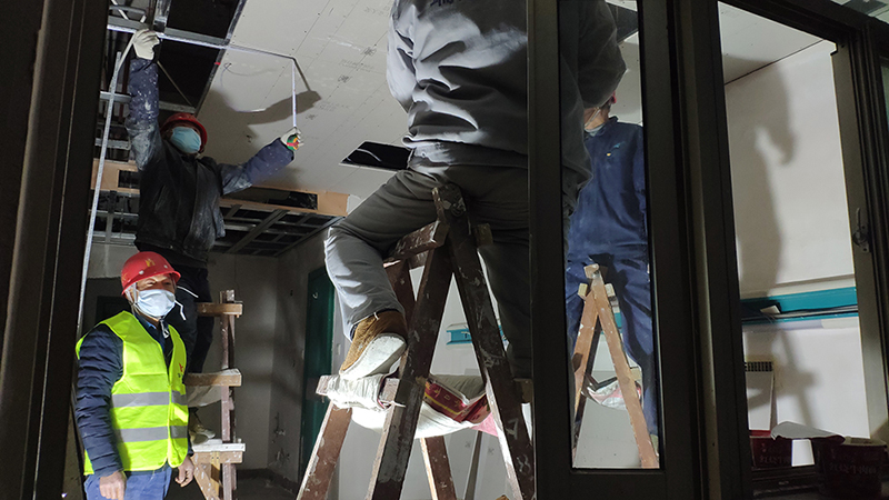 在裝飾施工如火如荼向前推進(jìn)時,揚(yáng)建集團(tuán)機(jī)電安裝公司也在同一時間行動了起來。該項目安裝工程現(xiàn)場負(fù)責(zé)人劉宏偉,臘月二十八深夜才回到遠(yuǎn)在吉林長春的老家,正準(zhǔn)備給勞碌一年的自己放個“長假”;正月初三下午,項目經(jīng)理童國軍的一個電話打斷了他的“新年計劃”。疫情就是命令,當(dāng)天夜里,劉宏偉就打了“飛的”回到揚(yáng)州。初四凌晨,等他到達(dá)工地的時候,安裝公司經(jīng)理卞正勛、項目經(jīng)理童國軍以及公司相關(guān)科室的負(fù)責(zé)人早已等候在項目現(xiàn)場。