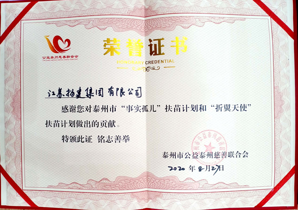 揚建網(wǎng)訊 8月27日,集團(tuán)公司積極參與泰州市“事實孤兒”扶苗計劃和“折翼天使”扶苗計劃,受到泰州市公益泰州慈善聯(lián)合會的表彰。