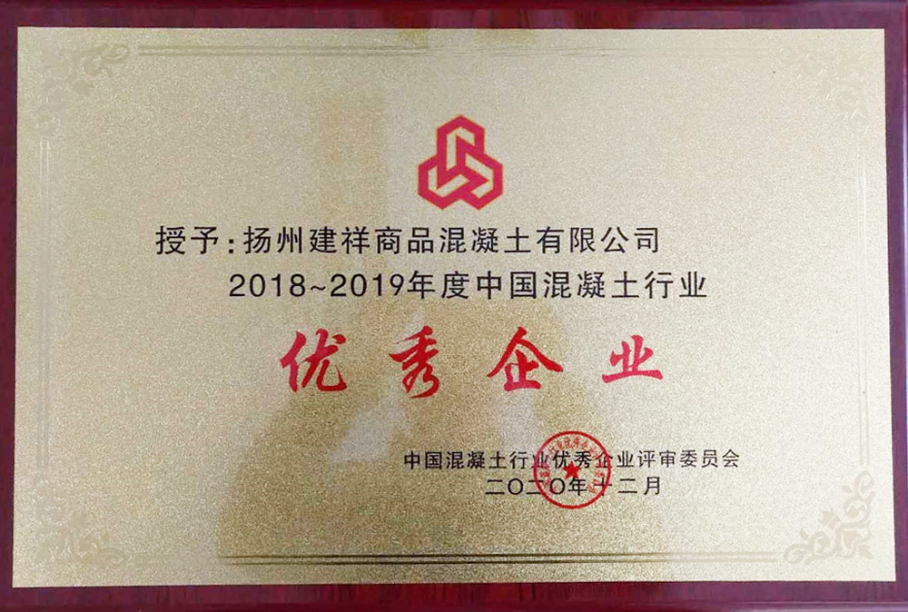 揚(yáng)建網(wǎng)訊 12月末,從中國(guó)建筑業(yè)協(xié)會(huì)混凝土分會(huì)傳來(lái)喜訊,江蘇建祥高新材料有限公司蟬聯(lián)“中國(guó)混凝土行業(yè)優(yōu)秀企業(yè)”榮譽(yù),榮獲了“2018-2019年度中國(guó)混凝土行業(yè)優(yōu)秀企業(yè)”的稱號(hào)。