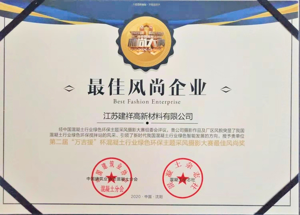 鑒于建祥公司投資新建的新型全封閉綠色環(huán)保生產(chǎn)基地(揚(yáng)州華運(yùn)新材料科技有限公司)在本區(qū)域具有標(biāo)桿意義,中國(guó)建筑業(yè)協(xié)會(huì)混凝土分會(huì)為建祥公司頒發(fā)了“第二屆萬(wàn)吉援杯混凝土行業(yè)綠色環(huán)保最佳風(fēng)尚企業(yè)”稱號(hào)。