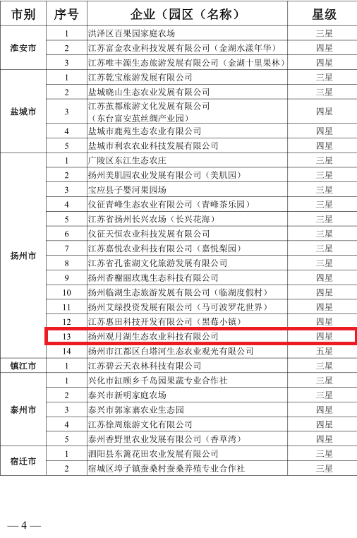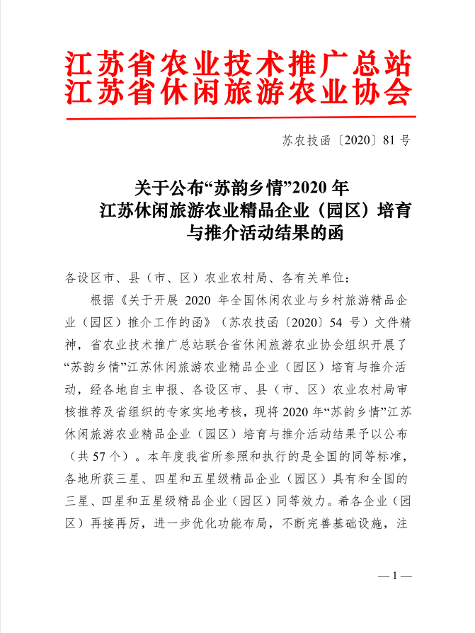 揚(yáng)建網(wǎng)訊 日前,省農(nóng)業(yè)技術(shù)推廣總站、休閑旅游農(nóng)業(yè)協(xié)會聯(lián)合下發(fā)文件,揚(yáng)州市觀月湖生態(tài)農(nóng)業(yè)科技有限公司順利通過“蘇韻鄉(xiāng)情”2020年江蘇休閑旅游農(nóng)業(yè)精品企業(yè)(園區(qū))“四星”驗收。該評星的通過,將為園區(qū)后期發(fā)展農(nóng)旅產(chǎn)業(yè)提供強(qiáng)有力的支持。