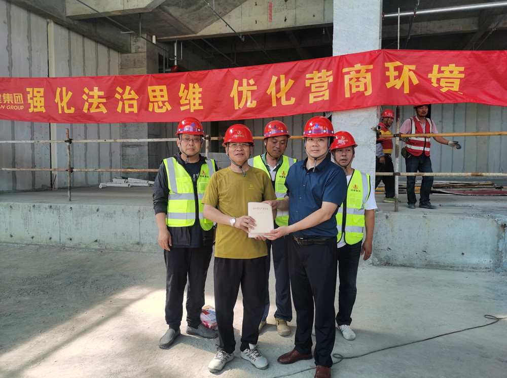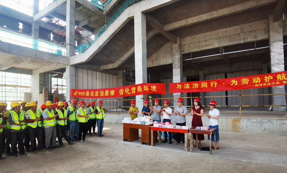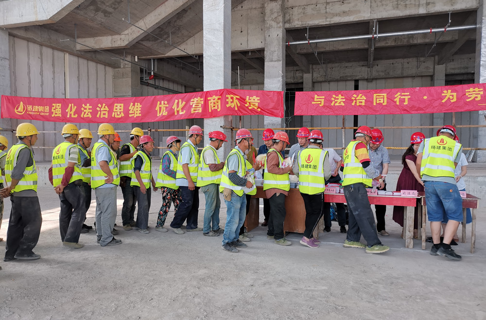 活動開始,市司法局領導詢問工人是否有法律方面的問題需要咨詢;并介紹了農民工兄弟維權合法渠道。接著,何平部長代表我集團對政府相關部門給予集團和農民工的關心關愛表示感謝,對辛勤奮斗在施工一線的工人兄弟表達了慰問。活動中,市相關部門領導給現(xiàn)場工人發(fā)放了《勞動法》《保障農民工工資支付條例》《工傷保險條例》《中國人民共和國民法典》等法律法規(guī)宣傳冊,并送去夏季防護用品,切實為工人謀實惠、辦實事,受到現(xiàn)場工人一致好評。