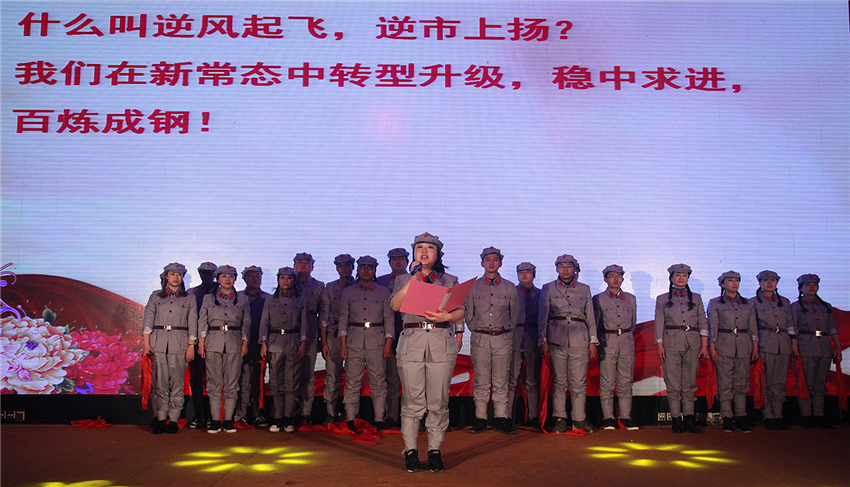 在華達公司員工表演的開場鼓《揚門女將》節(jié)目之后,曹德榮董事長以上聯“榮升特級、躋身百強,再接再厲奮步十三五”、下聯”深入轉型、持續(xù)創(chuàng)新,群策群力共鑄新輝煌”、橫批“新起點新跨越”的春聯,回顧過去、展望未來,并作了熱情洋溢的新春賀詞。