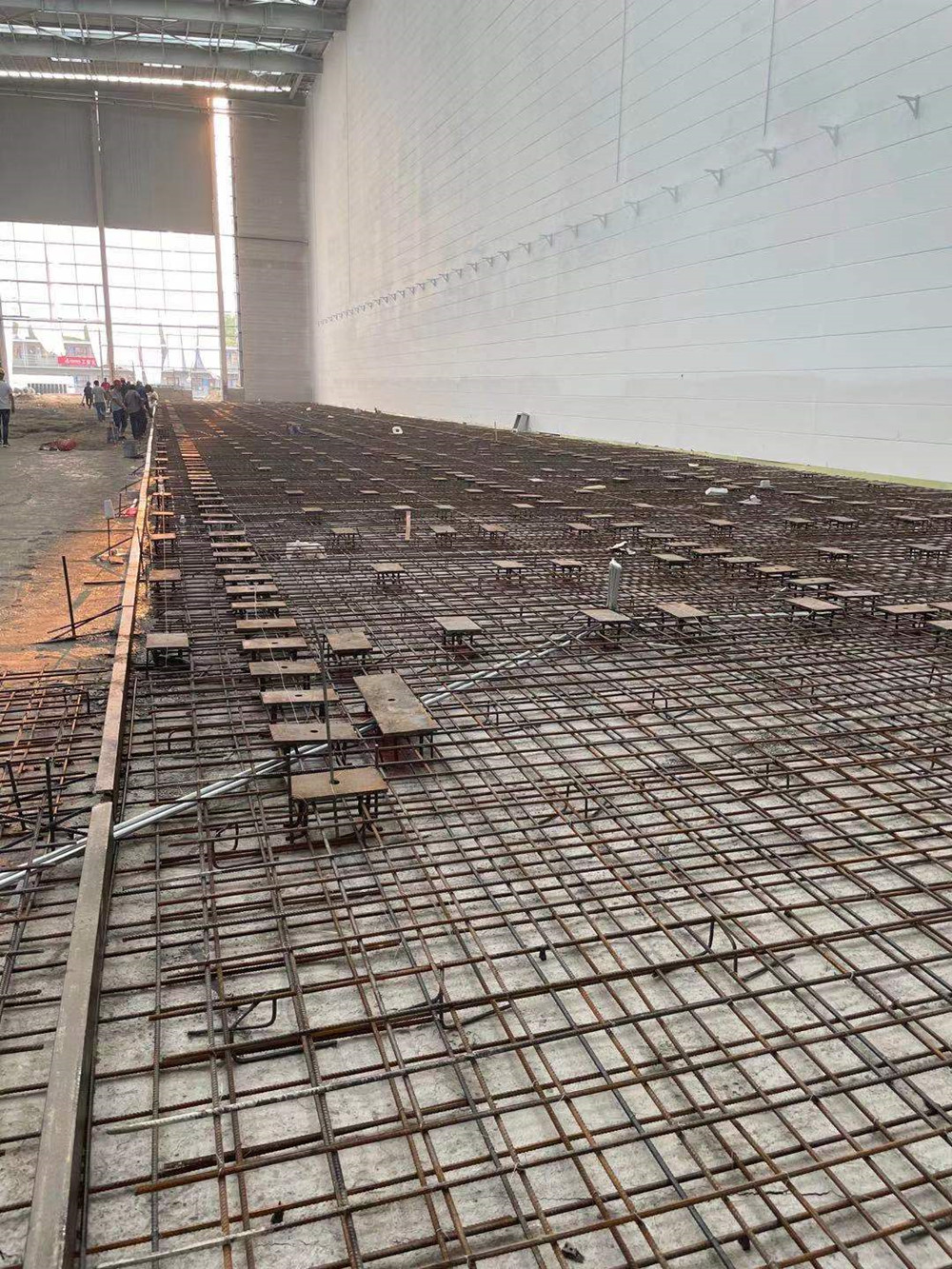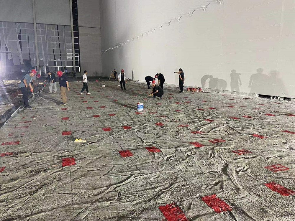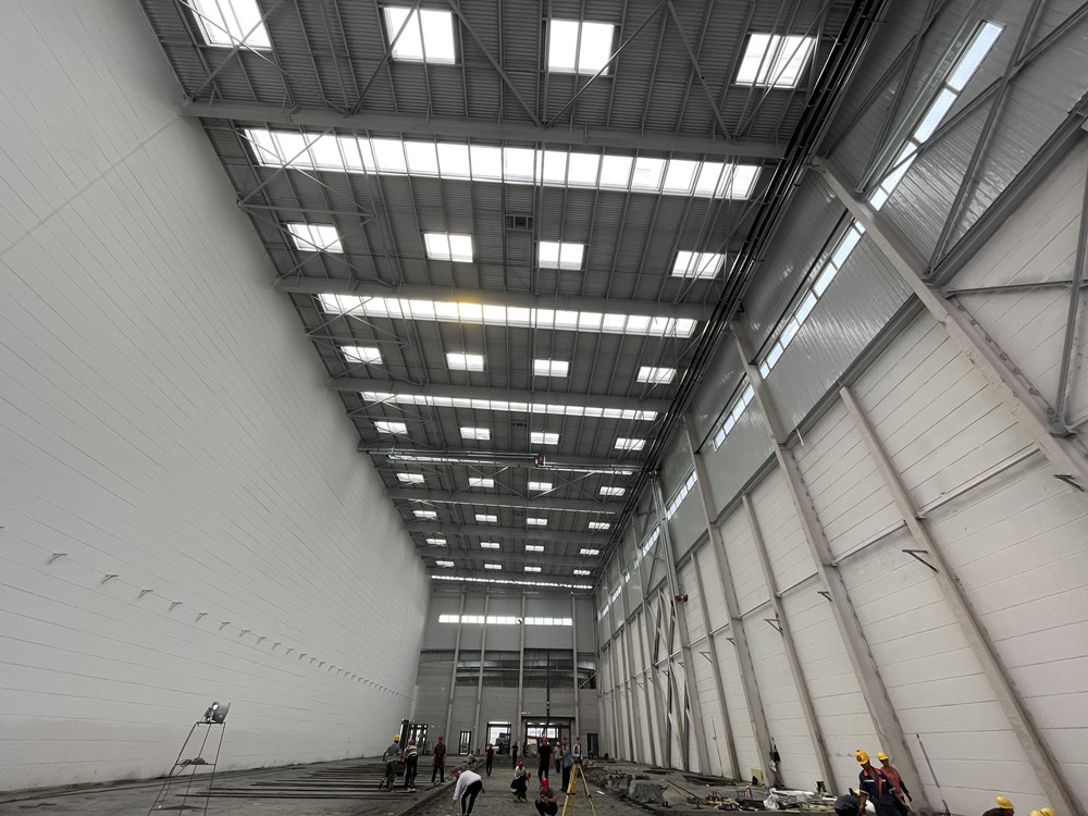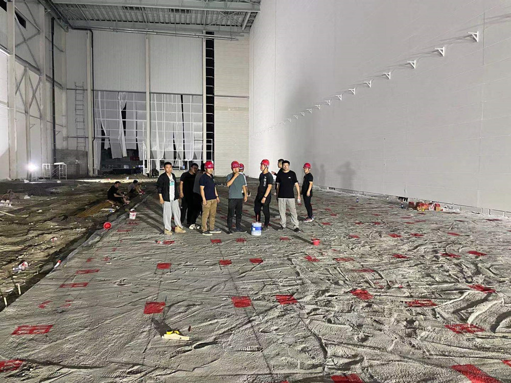 同時(shí)進(jìn)場,分進(jìn)合擊。隔墻板安裝隊(duì)組、地坪隊(duì)組、油漆隊(duì)組等多家隊(duì)組同時(shí)入場施工,面對多隊(duì)組交叉作業(yè),項(xiàng)目部做好了充分的計(jì)劃安排及保障措施。4000多平方米、24米高的立面隔墻板安裝,兩家隊(duì)組從東西兩個(gè)方向同時(shí)安裝,30個(gè)工人,耗時(shí)140多小時(shí),安裝了2000多塊隔墻板。過程中,安裝隊(duì)組攻克了預(yù)制的ALC墻板訂貨周期長、工人在夏季長時(shí)間高空作業(yè)等各種困難。油漆隊(duì)組緊跟安裝隊(duì)組,隔墻板裝好一個(gè)工作面就緊跟另一個(gè)工作面。墊層、防潮膜、保護(hù)層、放線、扎鋼筋、鐵件預(yù)埋、關(guān)模、澆筑地坪……在有限的時(shí)間里道道工序,層層把關(guān),都有條不紊地順利完成。