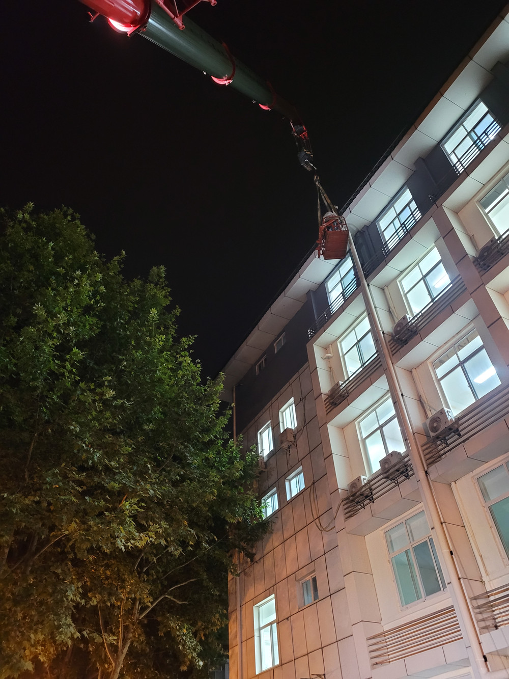 ——凌晨2點(diǎn),隨著時(shí)間的推移,為確保任務(wù)的完成,現(xiàn)場(chǎng)坐陣的卞總緊急增加了一臺(tái)25T的汽車吊車,大大加快了外墻排風(fēng)管道的安裝進(jìn)度;