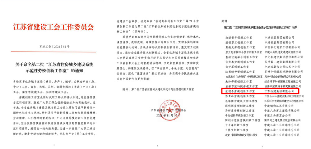 揚(yáng)建網(wǎng)訊 11月10日,從江蘇省建設(shè)工會(huì)工作委員會(huì)傳來(lái)喜訊,我集團(tuán)公司“張迎春勞模創(chuàng)新工作室”榮獲省住房城鄉(xiāng)建設(shè)系統(tǒng)示范性勞模創(chuàng)新工作室稱(chēng)號(hào)。