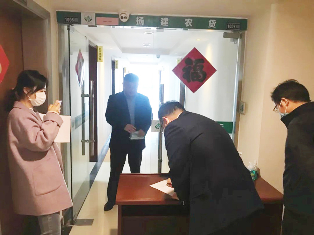 揚建小貸董事長周軍、總經理沈岐清,接待并介紹了公司在疫情防控、辦公場所消毒、人員進出登記、掃碼檢查、體溫檢測等方面所做的防范措施。