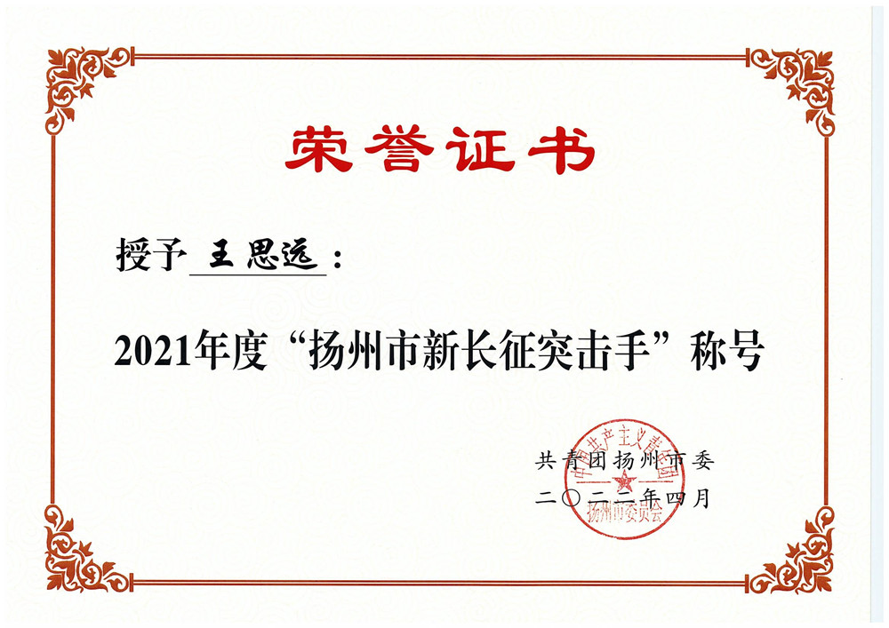 揚(yáng)建網(wǎng)訊 近日,團(tuán)市委表彰了一批先進(jìn)集團(tuán)和優(yōu)秀個(gè)人,揚(yáng)建集團(tuán)王思遠(yuǎn)同志榮獲2021年度揚(yáng)州市“新長(zhǎng)征突擊手”稱號(hào)。