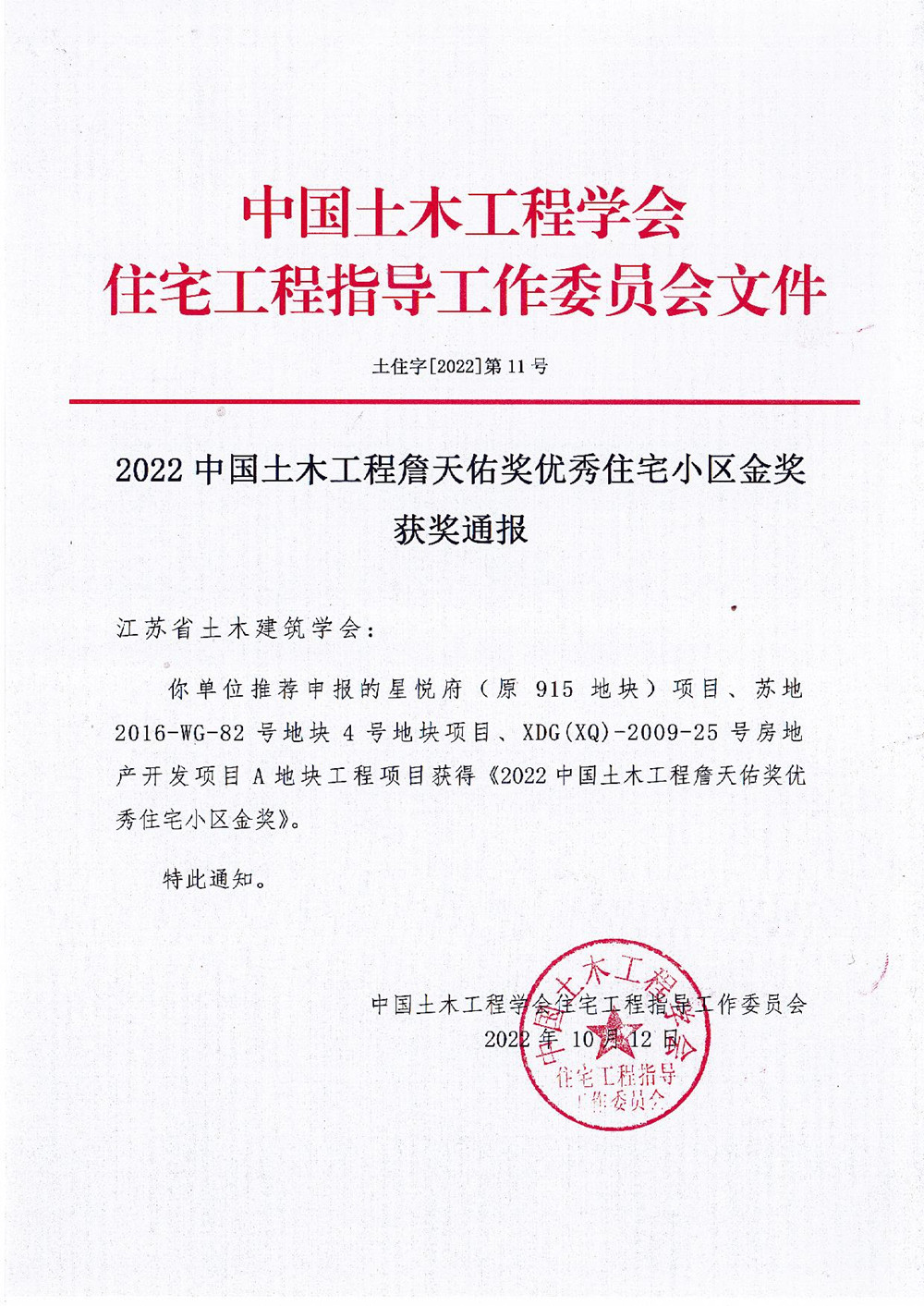 揚建網(wǎng)訊 近日,中國土木工程學(xué)會住宅工程指導(dǎo)工作委員會揭曉了“2022年中國土木工程詹天佑獎優(yōu)秀住宅小區(qū)金獎入選工程”名單,集團公司承建的星悅府(原915地塊)住宅項目在眾多項目中突出重圍,斬獲金獎。