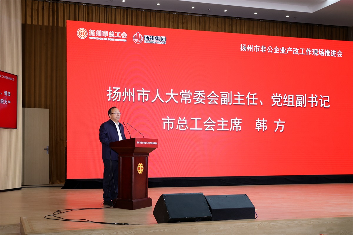韓方在作總結(jié)講話時(shí)指出,召開推進(jìn)會(huì)旨在進(jìn)一步落實(shí)習(xí)近平總書記在同中華全國(guó)總工會(huì)新一屆領(lǐng)導(dǎo)班子成員集體談話時(shí)的重要講話精神以及中國(guó)工會(huì)十八大精神,促進(jìn)全市非公企業(yè)產(chǎn)改工作擴(kuò)面提質(zhì)增效。他高度評(píng)價(jià)了揚(yáng)建集團(tuán)產(chǎn)改工作所起到的示范引領(lǐng)作用,對(duì)全市非公企業(yè)產(chǎn)改工作提出三點(diǎn)要求:一是提高站位,充分認(rèn)識(shí)推動(dòng)非公企業(yè)產(chǎn)改工作的重要意義。二是聚焦重點(diǎn),以更大力度推動(dòng)非公企業(yè)產(chǎn)改工作取得實(shí)效。三是統(tǒng)籌資源,凝聚推進(jìn)非公企業(yè)產(chǎn)改工作合力。在市委市政府的堅(jiān)強(qiáng)領(lǐng)導(dǎo)下,守正創(chuàng)新、發(fā)力奮進(jìn),實(shí)干爭(zhēng)先、團(tuán)結(jié)奮斗,鍥而不舍推進(jìn)全市非公企業(yè)產(chǎn)改工作取得新突破、結(jié)出新碩果,為全面推進(jìn)中國(guó)式現(xiàn)代化揚(yáng)州新實(shí)踐做出更大貢獻(xiàn)。