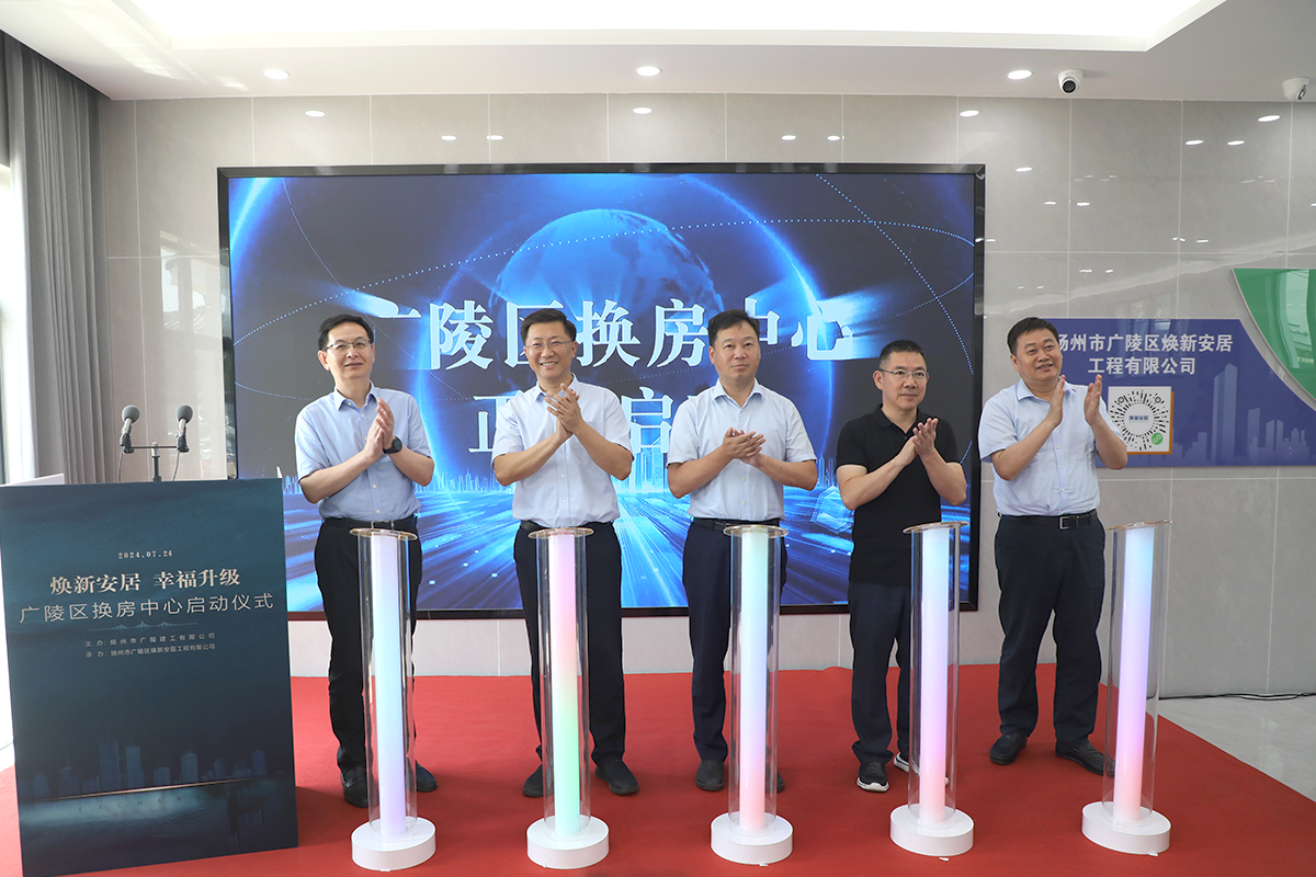 揚(yáng)建網(wǎng)訊 7月24日上午,廣陵區(qū)換房中心啟動(dòng)儀式在揚(yáng)建集團(tuán)福運(yùn)門(mén)辦公區(qū)(揚(yáng)州市廣陵區(qū)南通東路80號(hào))隆重舉行。揚(yáng)州市住房和城鄉(xiāng)建設(shè)局黨委書(shū)記、局長(zhǎng)徐安朝,廣陵區(qū)委副書(shū)記、區(qū)長(zhǎng)郎俊,揚(yáng)州市住房和城鄉(xiāng)建設(shè)局黨委委員、副局長(zhǎng)朱元,江蘇揚(yáng)建集團(tuán)有限公司黨委書(shū)記、董事長(zhǎng)康往東出席,廣陵區(qū)委常委、副區(qū)長(zhǎng)王兵,江蘇揚(yáng)建集團(tuán)有限公司總經(jīng)理鄒厚存出席并致辭,市住建局、自然資源和規(guī)劃分局、廣陵經(jīng)開(kāi)區(qū)、廣陵建工、相關(guān)街道社區(qū)負(fù)責(zé)人以及廣陵區(qū)3大國(guó)有房企負(fù)責(zé)人等領(lǐng)導(dǎo)齊聚啟動(dòng)儀式現(xiàn)場(chǎng),共同見(jiàn)證這一創(chuàng)新時(shí)刻。