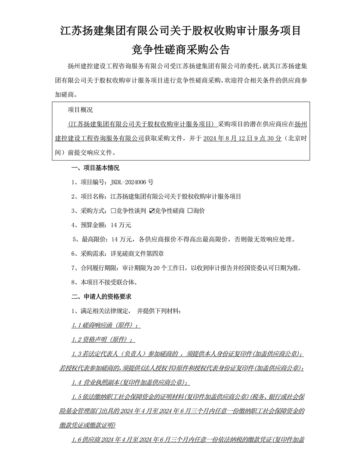 附件:江蘇揚(yáng)建集團(tuán)有限公司關(guān)于股權(quán)收購審計(jì)服務(wù)項(xiàng)目競爭性磋商采購公告