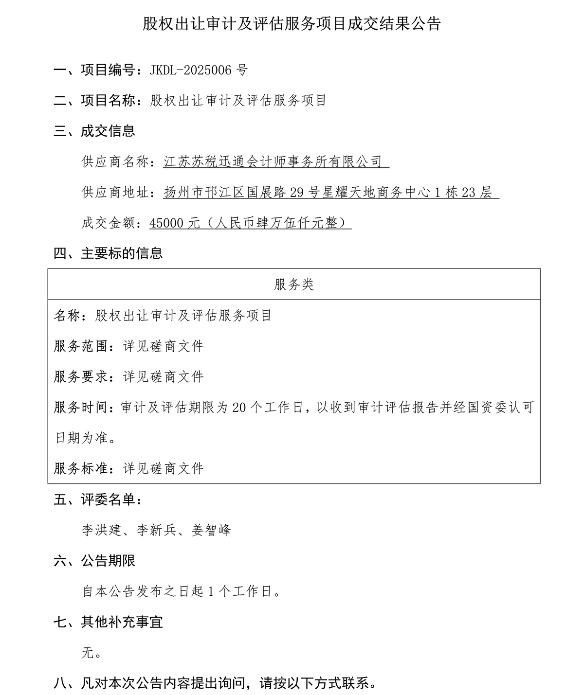 股權(quán)出讓審計及評估服務項目成交結(jié)果公告